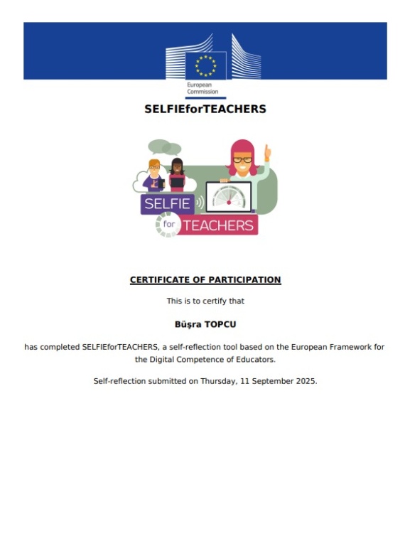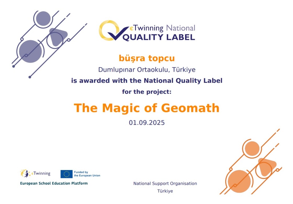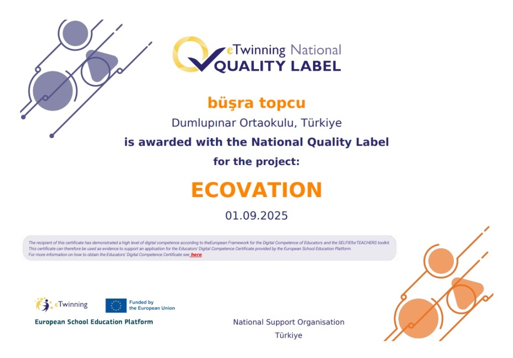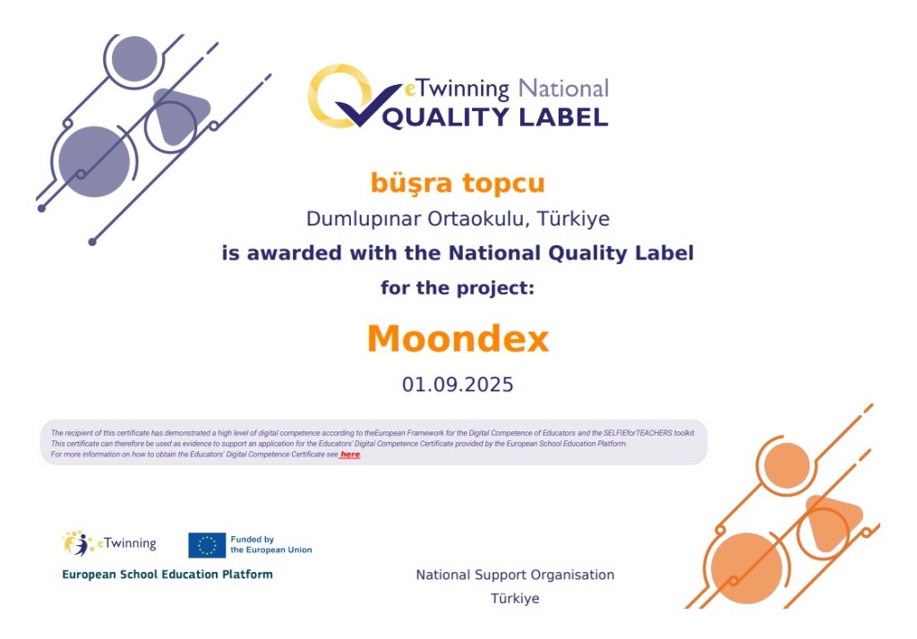 Okulumuz Matematik Öğretmeni Büşra TOPCU, yürüttüğü eTwinning projeleriyle bu yıl da önemli bir başarıya imza attı. 2024-2025 eğitim-öğretim yılında gerçekleştirdiği dört farklı proje, Ulusal Kalite Etiketi almaya layık görüldü. Ayrıca, Moondex ve Ecovation projeleri; Öğretmenlerin Dijital Yeterliliği için Avrupa Çerçevesi (DigCompEdu) ve SELFIE for TEACHERS değerlendirmelerine göre yüksek düzeyde dijital yeterlilik sergileyerek sertifika ile ödüllendirildi.